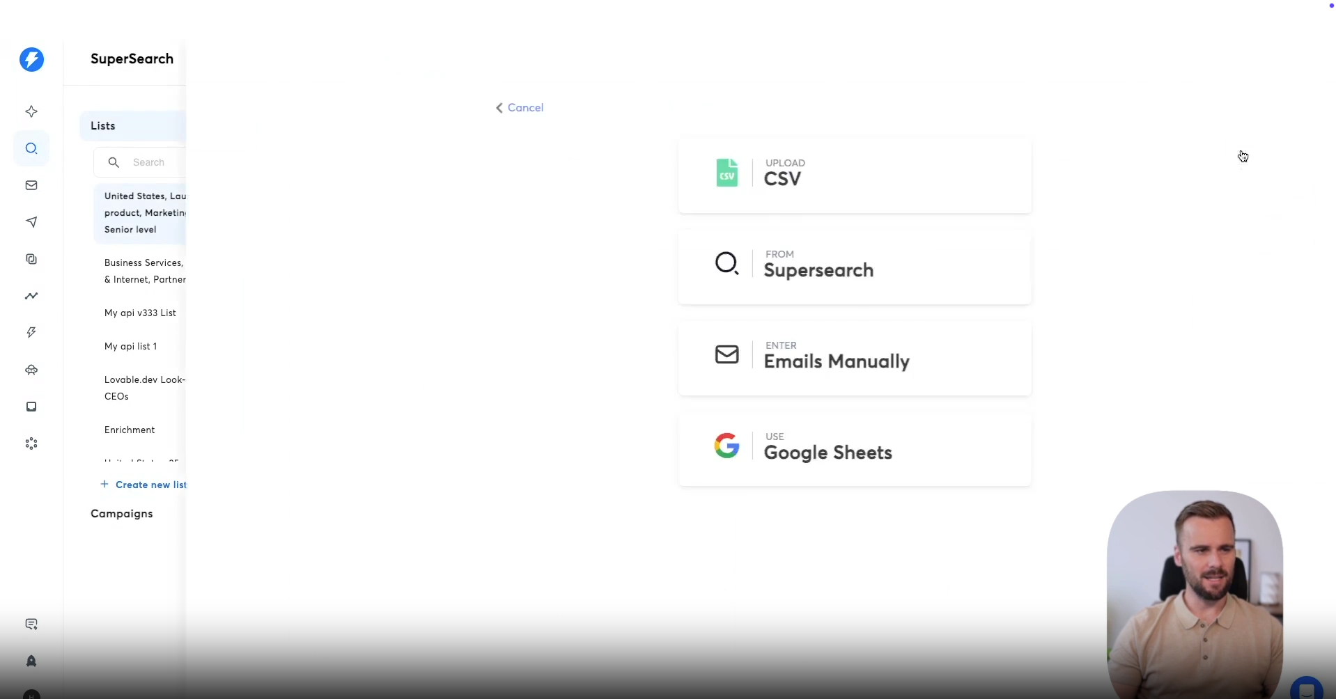 Direct search through SuperSearch generates leads matching specific criteria. These searches create net-new lists based on your targeting parameters. Most net-new prospecting starts with SuperSearch-generated lists.