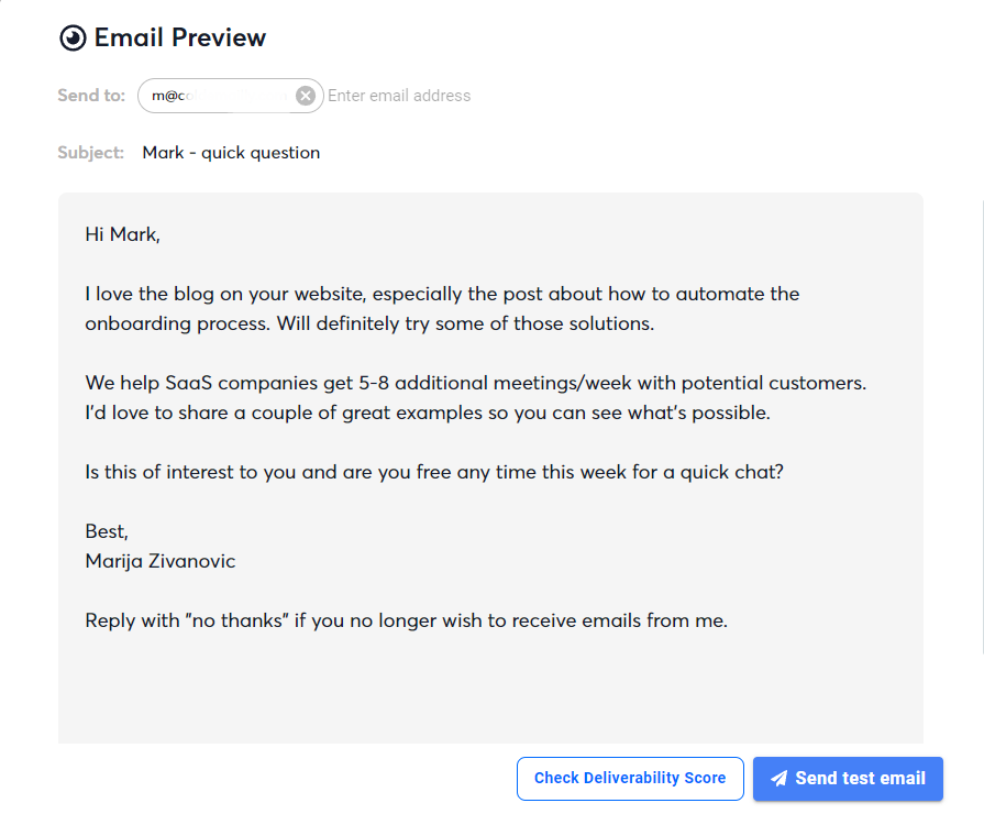 Show that you have actually taken a look at your target’s business, offer, or product by starting with a personal and relevant first line. An additional benefit of looking at all these different websites, offers and value propositions of your prospects is that you’ll get a much deeper understanding of the market and where they’re at.