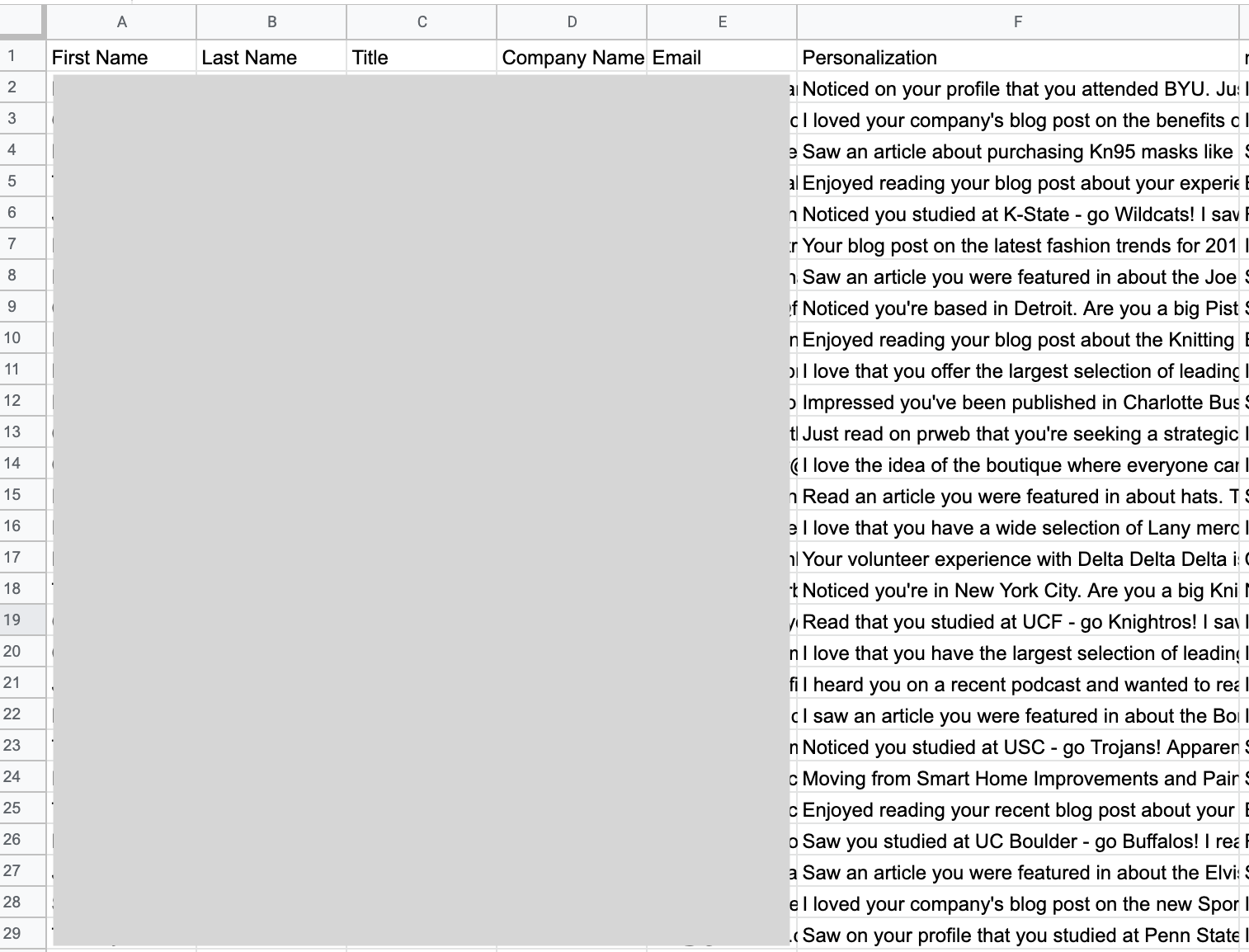 Step 1) Prepare a lead list in Google Sheets or Excel and add a column named Personalization.