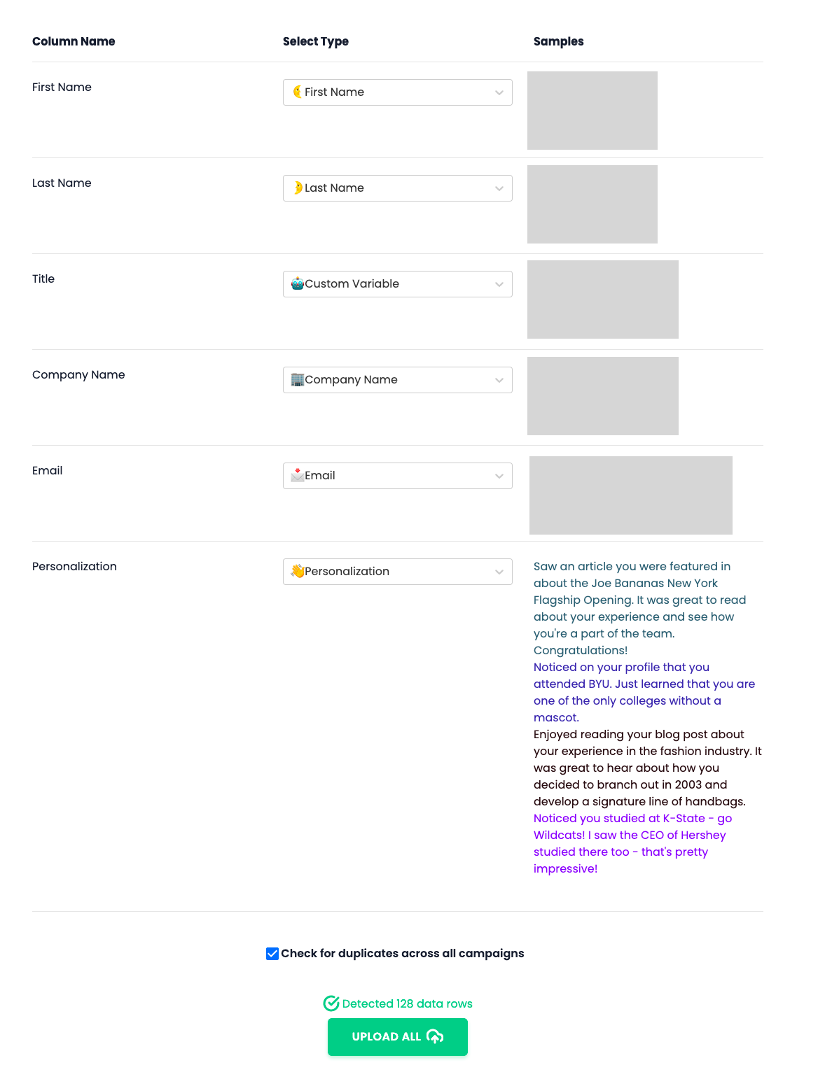 Step 3) Upload the lead list to your Instantly campaign. It will automatically detect the personalization column and attribute the {{Personalization}} tag.