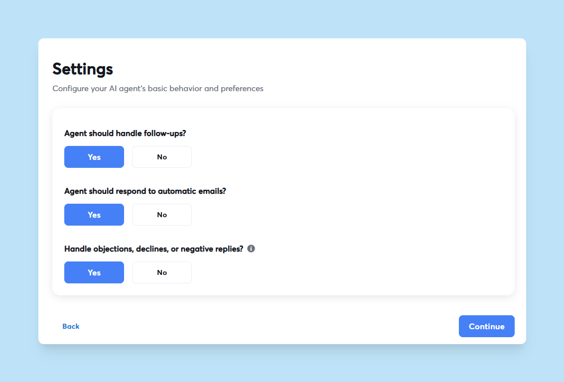 - Input instructions like "never send follow-ups if a meeting is already booked" or "always offer a calendar link when a lead expresses interest."