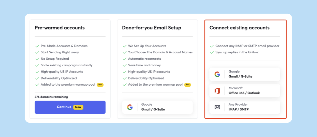 Traditional email tools charge per seat, eroding margins as you scale. Instantly's pricing model includes unlimited email accounts and warmup on all plans: