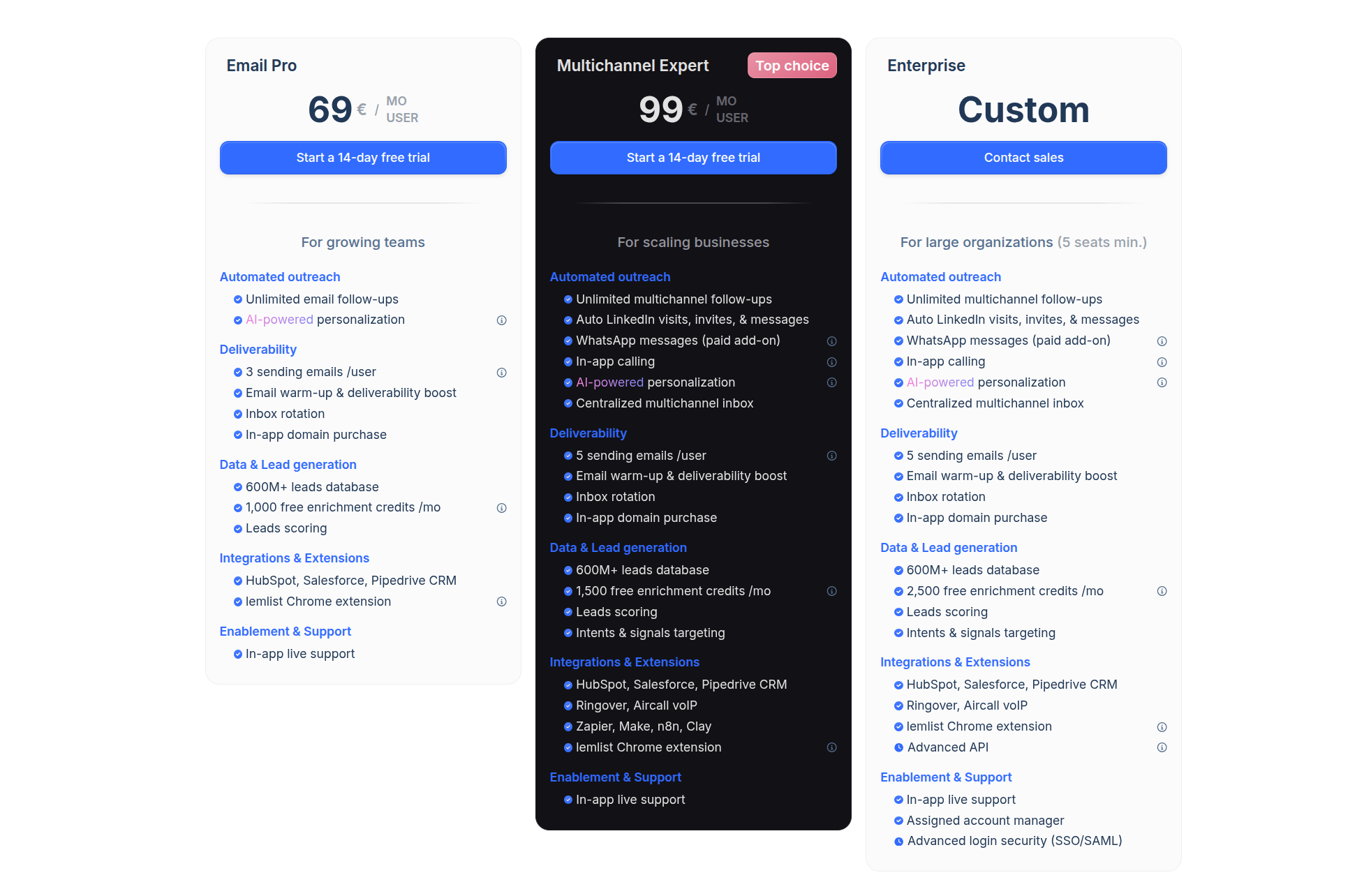 Lemlist charge per user, with Standard and Pro tiers starting at $69 per seat per month, plus an Enterprise tier for larger teams. Pro adds multichannel and workflow depth, and a large people database is included in plan value. Costs rise with each additional user and any inbox rotation add‑ons.