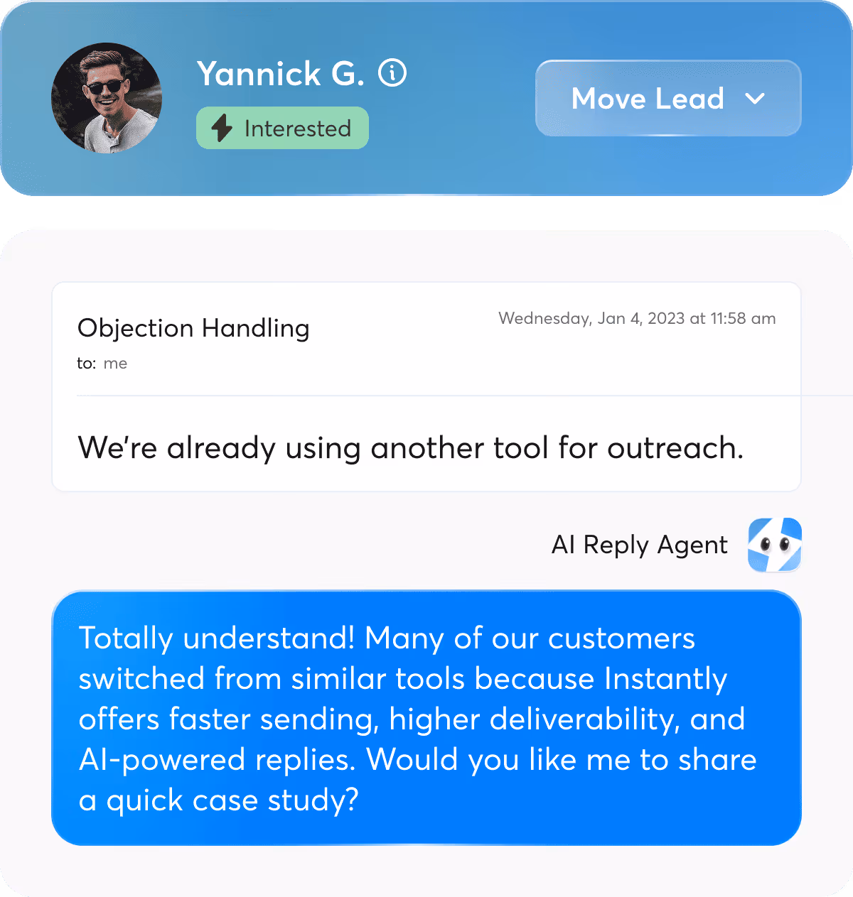Lass nicht zu, dass eine schlechte Zustellbarkeit deine Pipeline zum Erliegen bringt. Schließen Sie sich mehr als 50.000 Vertriebsteams an, die auf Instantly umgestiegen sind, um eine bessere Platzierung im Posteingang, höhere Antwortraten und mehr abgeschlossene Geschäfte zu erzielen.