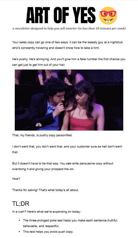 This way, you cater to both casual and committed readers. For example, a quick-win tip at the top of your email, followed by a deeper explanation for those who continue reading. Here’s an exceptional example in the wild: