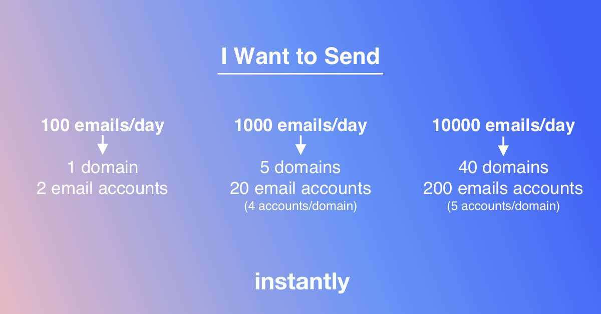 If you want to do high volume (10+ positive replies/day) I recommend you get 10 secondary sending domains. E.g. if your domain is instantlywizard.com your secondary sending domains can be named instantlypro.com, meetinstantly.com, tryinstantly.com, etc. Have all the secondary domains redirect to the main domain. And have all the email accounts forward to one main master inbox, from which you can reply from.
