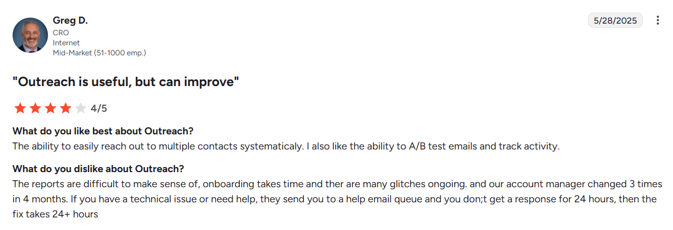 Like any powerful tool, Outreach.io tends to be complex. Users frequently report that getting up to speed is time-consuming, especially for newer reps or teams without dedicated technical support. While Outreach.io does offer sales coaching and onboarding services, the learning curve can still slow teams down: